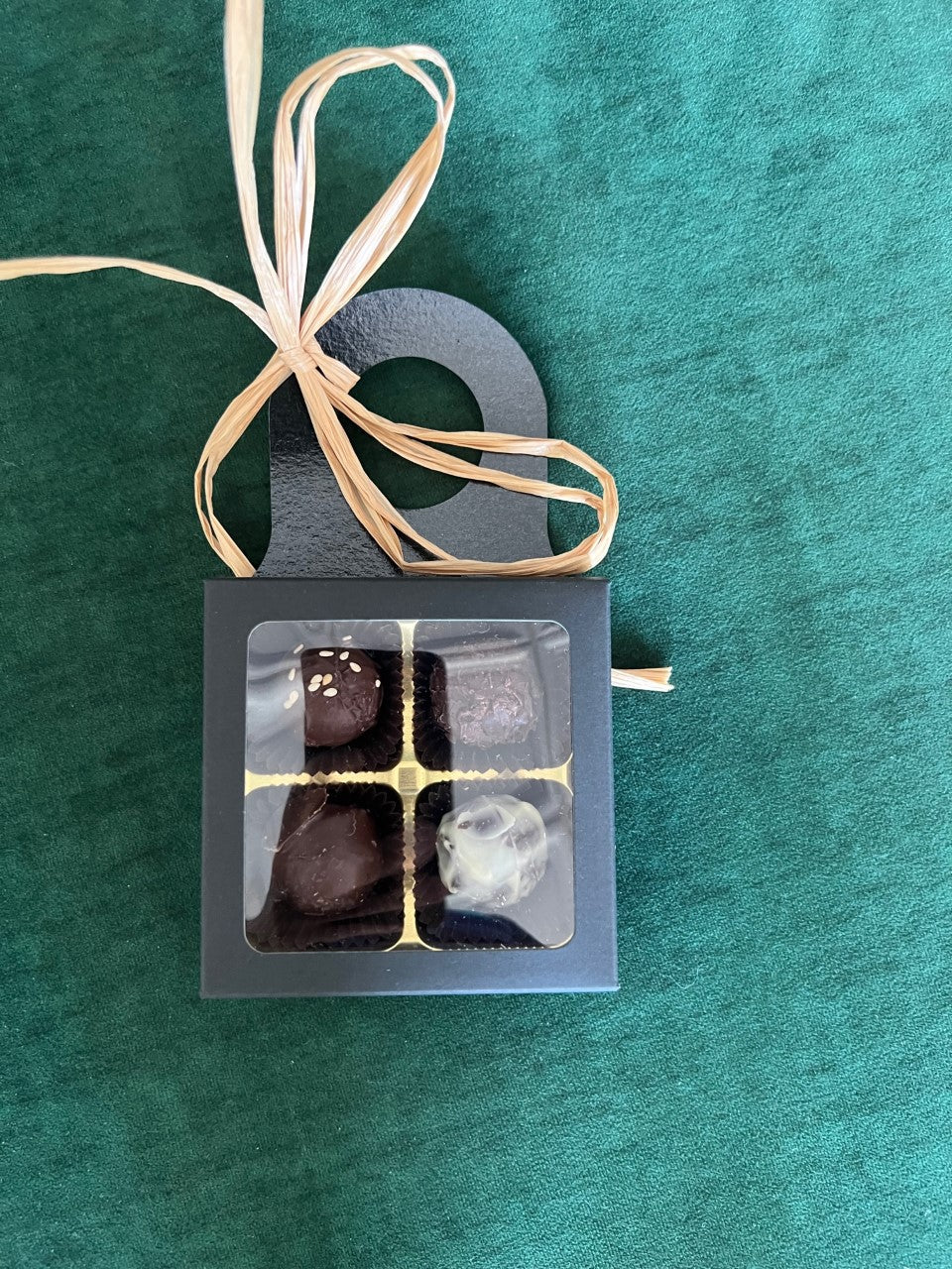 - Hauser Chocolates Assorted Truffles (4) in a black box that that hangs off of the neck of the wine bottle