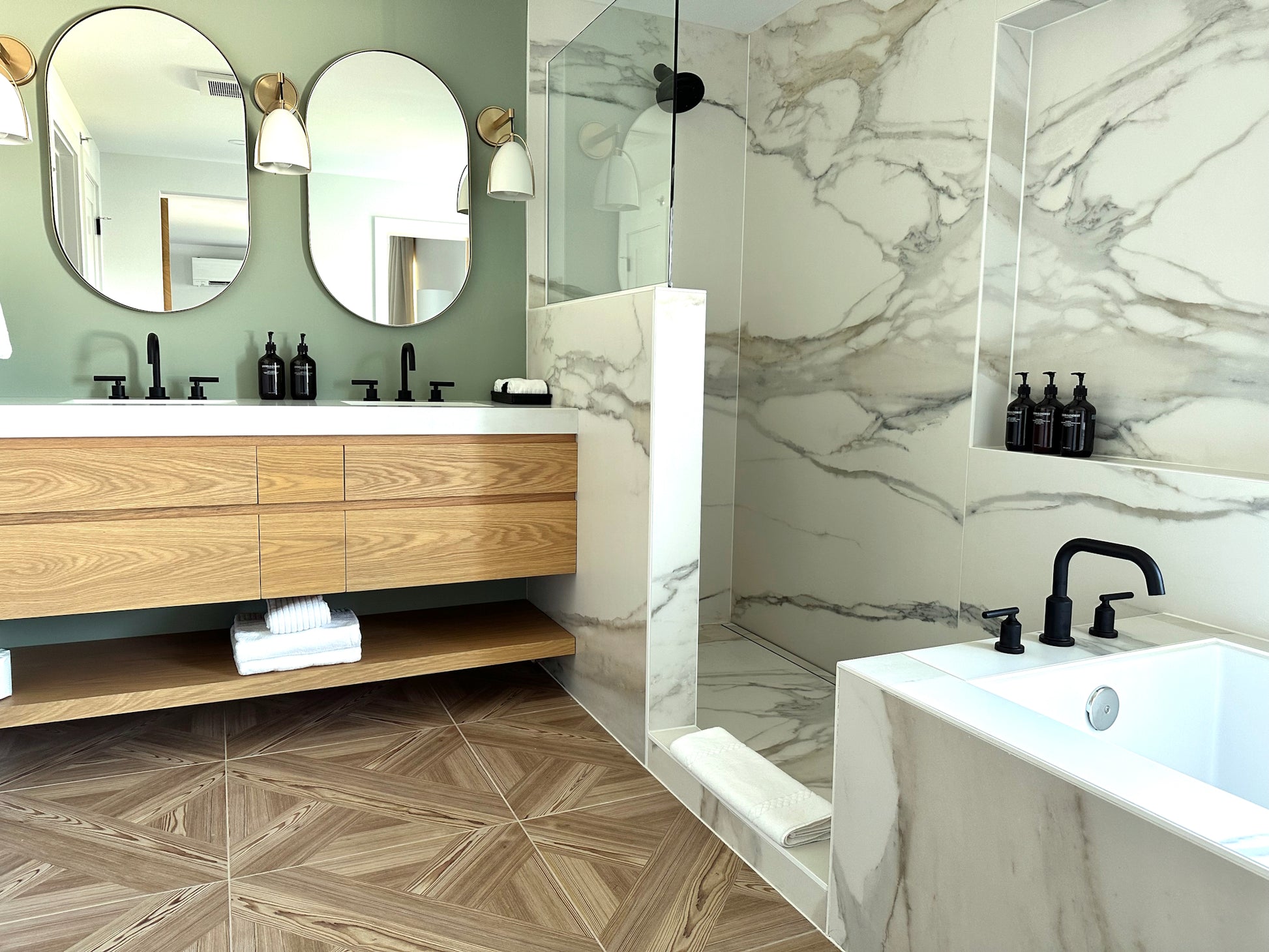 These new modern guestrooms are located in the South Wing addition to the property and the spacious accommodations feature king beds and luxurious bathrooms. Each private bathroom features dual sinks, a walk-in shower, deep soaking tub, and a private commode. The bedroom space includes a king bed, dresser, flat panel tv, sitting area, ottomans, and bedside tables.